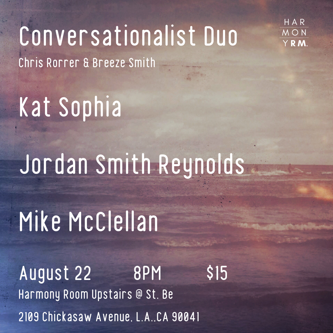*Updated Performers: Conversationalist Duo with Kat Sophia, Jordan Smith Reynolds and Mike McClellan LIVE @ The Harmony Room Upstairs at St. Be, August 22